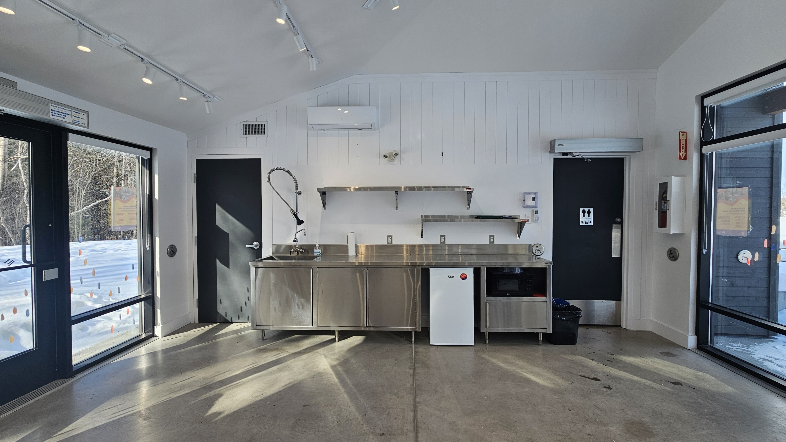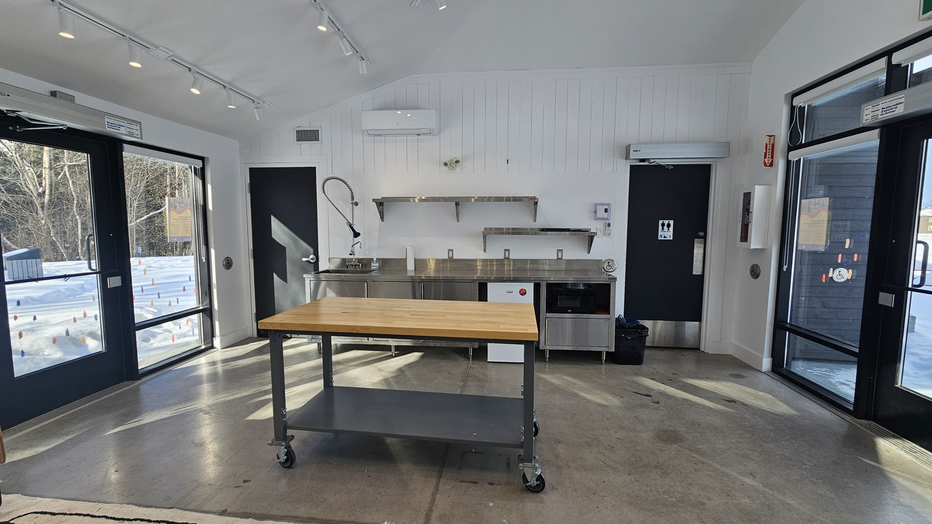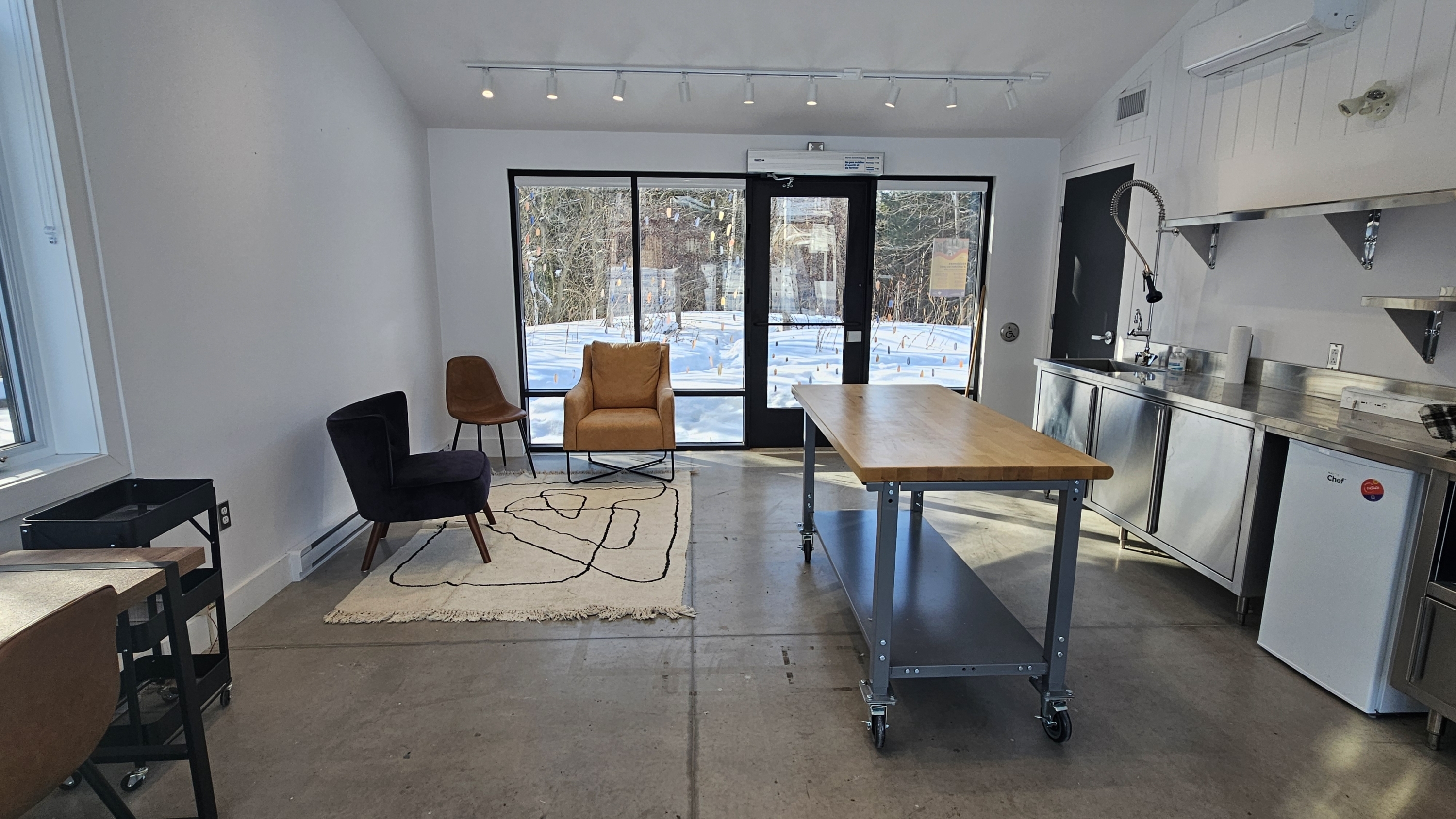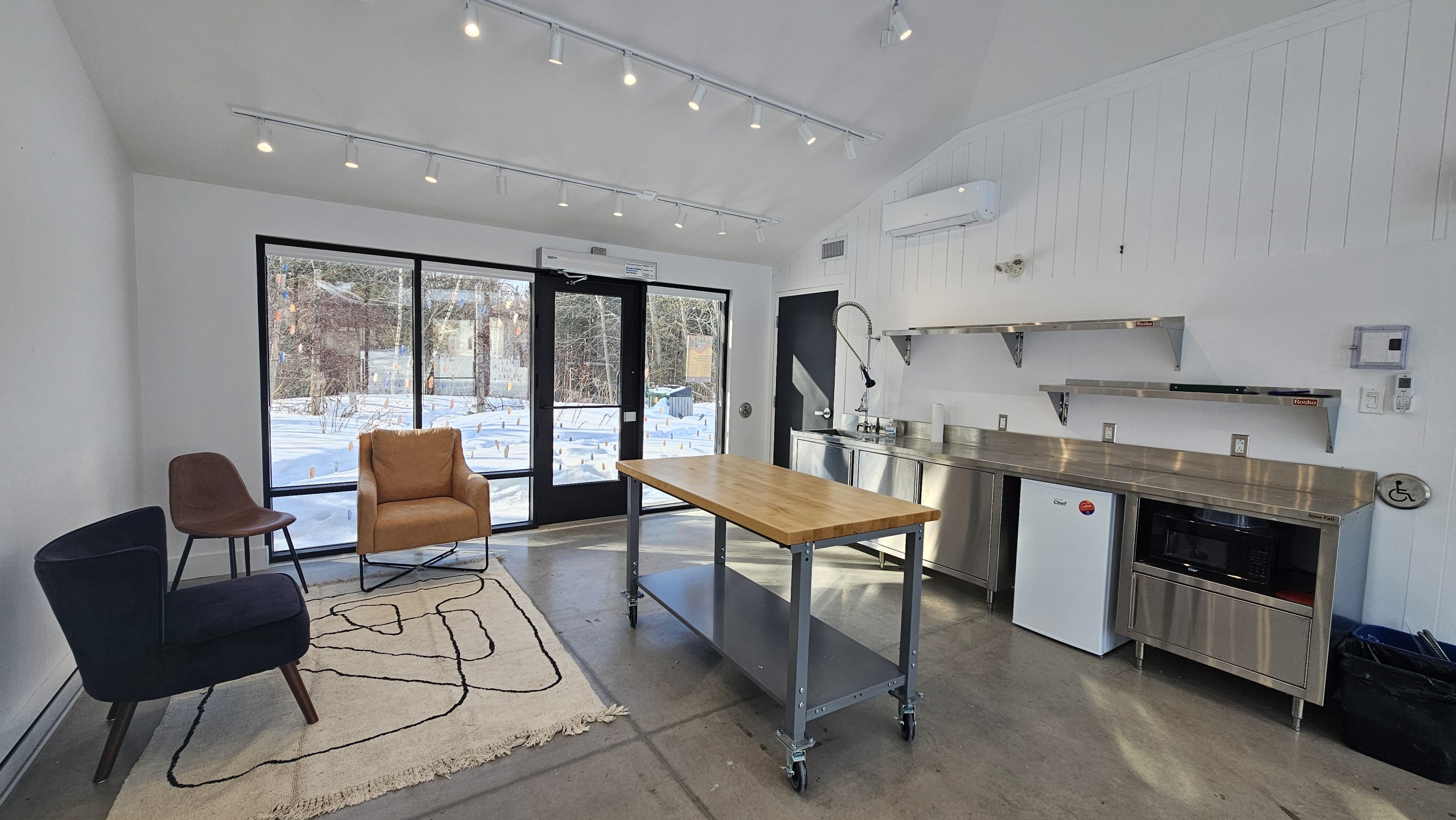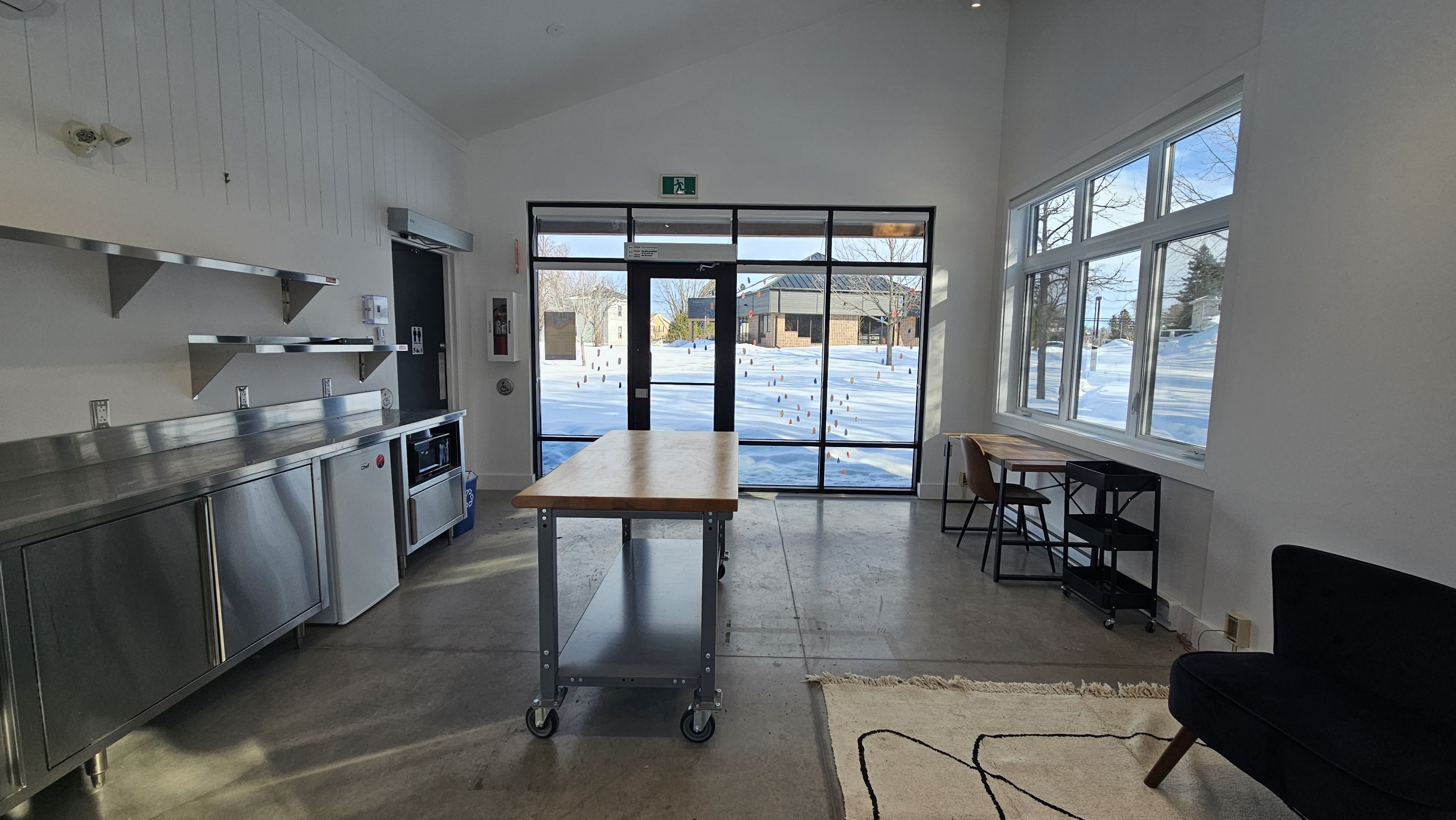 Un mobilier de base pour travailler est présent en tout temps dans le pavillon. Consultez la section sur les informations techniques du pavillon pour plus de détails.