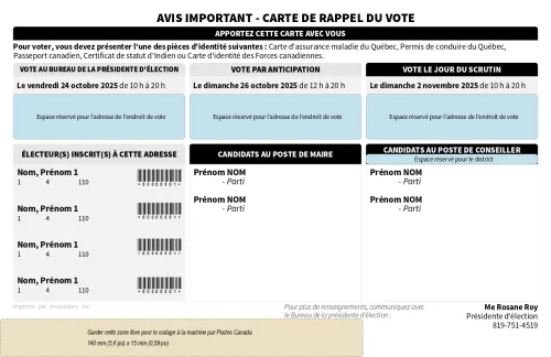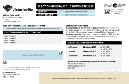 En raison de la grève de Postes Canada, les avis feront l’objet d’une distribution à domicile d’ici le mercredi 15 octobre inclusivement. La distribution sera assurée par Taxi Vétérans. Les élections générales se dérouleront le dimanche 2 novembre 2025.