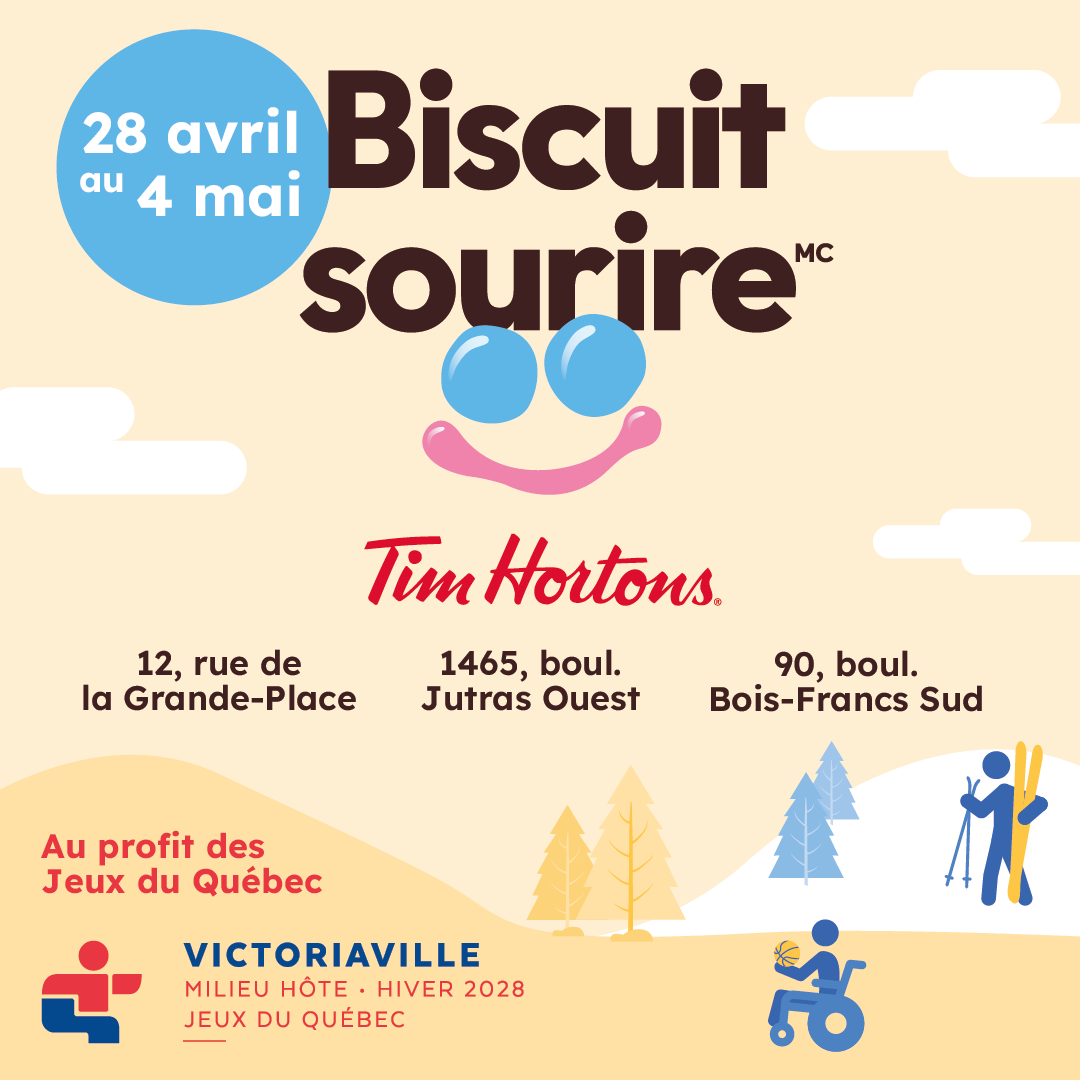 L’ensemble des recettes générées par la vente des biscuits sourire dans les trois restaurants participants de Victoriaville — soit ceux situés au 12, rue de la Grande-Place, au 1465, boulevard Jutras Ouest, ainsi qu’au 90, boulevard des Bois-Francs Sud — sera versé directement à l’organisation de cette grande fête du sport amateur. Il s’agit d’une façon simple et accessible pour la population de soutenir un événement d’envergure. Chaque biscuit sera vendu au coût de 2 $.