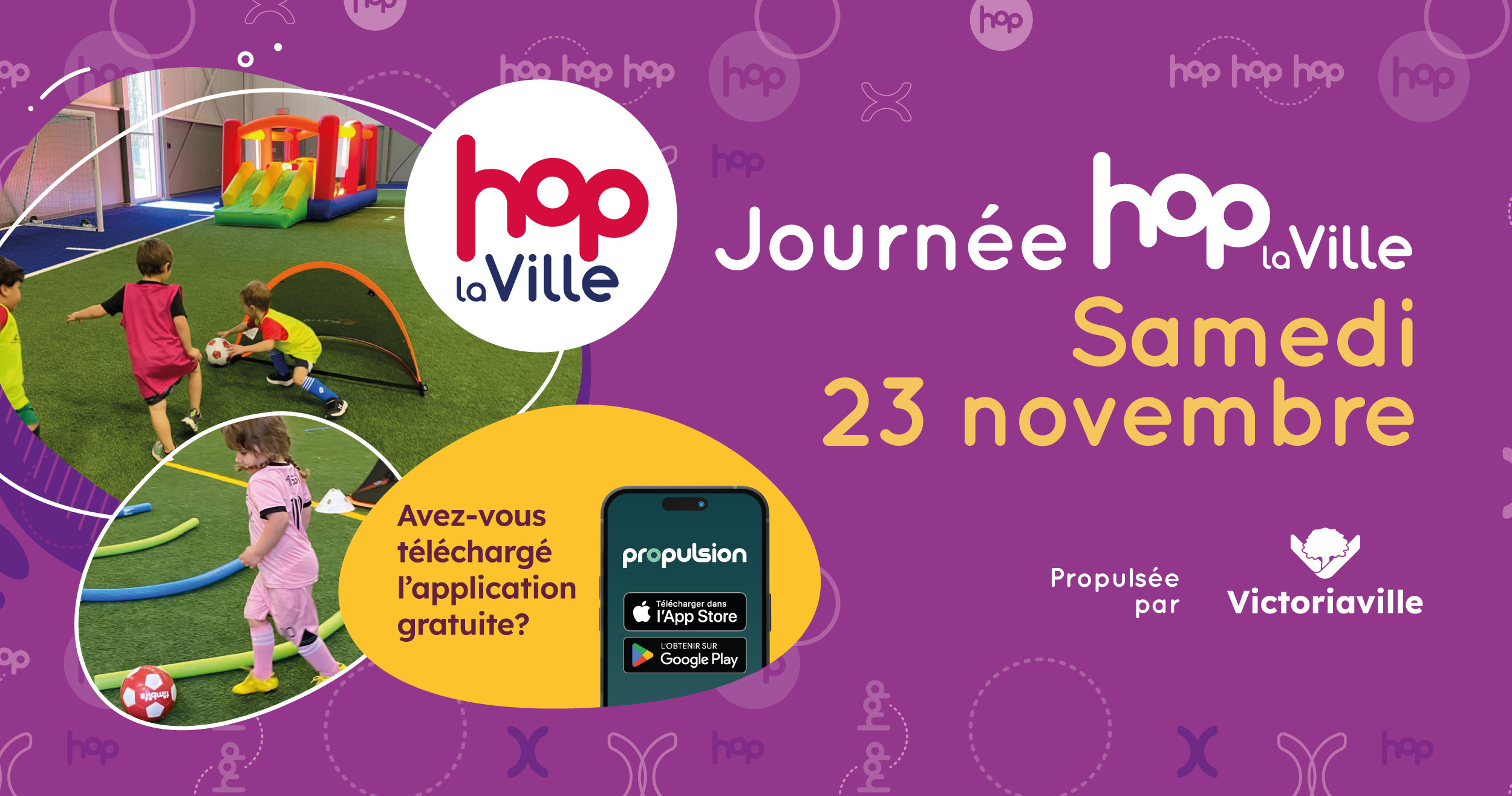 Envie d’une journée dynamique et amusante en famille ou entre amis? Ne manquez pas la prochaine journée Hop la Ville! Au programme : soccer, chant choral, bottes trampolines, escalade, conférence, skateboard, curling, jeu d’évasion et accès gratuit à la piscine, dek hockey, pickleball, badminton, Skateparc et patinage libre!