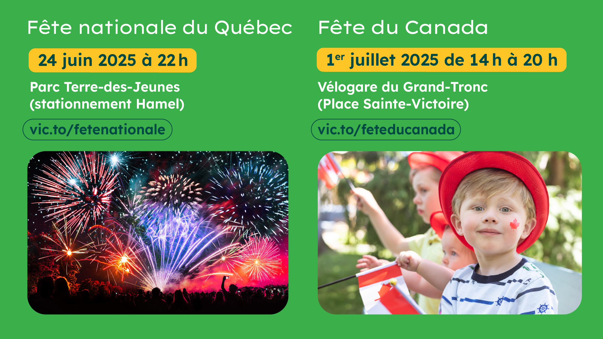 Le mardi 1er juillet, une programmation riche en activités vous attend pour célébrer la fête du Canada. La population est attendue à la Vélogare du Grand-Tronc dès 14 h (place Sainte-Victoire) pour une ambiance familiale et festive.